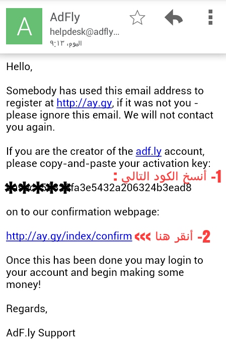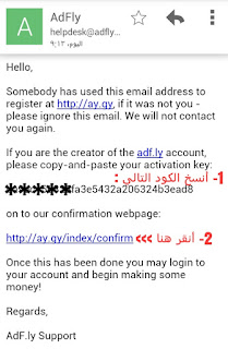 و الآن قم بالذهاب إلى الرسالة التي تم إرسالها لك ، و سوف تجدها كما في الصورة التالية ، قم بنسخ الكود المرقم برقم 1 ثم أنقر على الرابط المشار إليه برقم 2