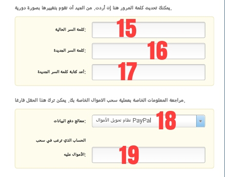 بالنسبة للخانات 15 و 16 و 17 فيمكنك تركها فارغة ، فهي تتعلق بإذا ما كنت تريد تغيير كلمة السر أم لا18 – إختر وسيلة الدفع التي تريد إستخدامها لإستلام أرباحك ، بحيث يمكنك الإختيار ما بين بايبال أو بايونيرز19- أكتب البريد الإلكتروني لحسابك في وسيلة الدفع التي قمت بإختيارها ، فمثلا إن كنت تريد استلام أرباحك عن طريق بايبال فاكتب البريد الإلكتروني لحسابك في بايبال ، و إن كنت تريد استلام أرباحك عن طريق بايونير فاكتب البريد الإلكتروني لحسابك في بايونير