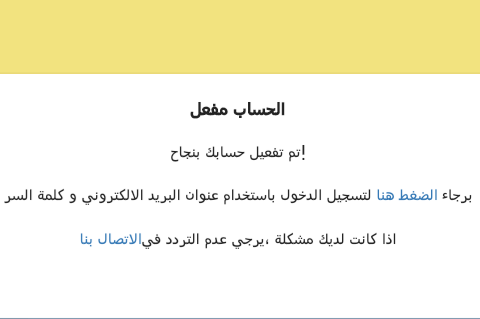 بعد ذلك سوف تظهر لك الصفحة التالية تخبرك بأنه قد تم تفعيل حسابك ، و الآن أنقر على عبارة « الضغط هنا » من أجل تسجيل الدخول إلى حسابك