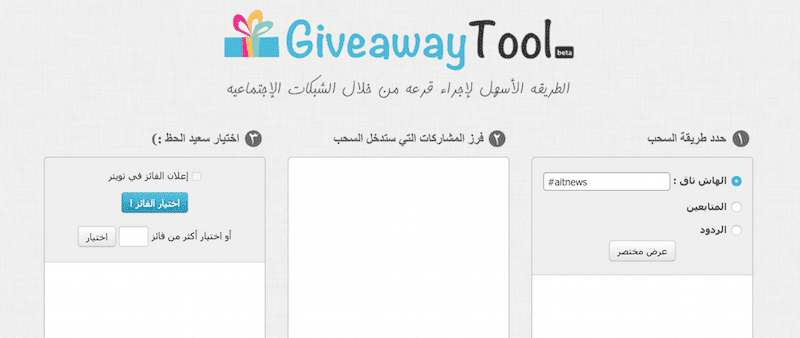 4- موقع GiveawayTool:هذه الخدمة البسيطة تتيح لك . تتميز هذه الخدمة بأنها عربية بالكامل مما يسهل التعامل معها. يمكنك الاستفادة من هذه الخدمة في ثلاث خطوات.