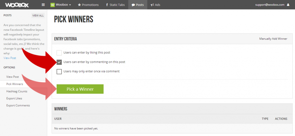 تستطيع وضع رابط المنشور داخل الأداة، ومن ثم اختيار شروط اختيار الفائز مثل الاختيار من التعليقات فقط أو من التعليقات التي كتبت إجابة صحيحة.ستقوم الأداة تلقائياً بالبحث عن المشتركين الفائزين، وبعد ذلك ستعطيك النتيجة النهائية.وتسمح لك هذه أداة قرعة السحب الالكتروني باختيار الفائز من بين الذين قاموا بعمل التالي :